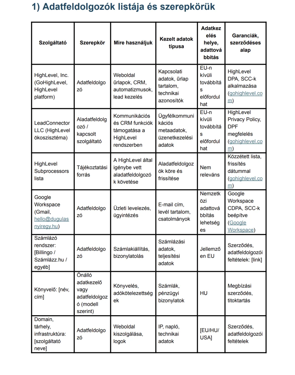 Címzettek, adatfeldolgozók: GoHighLevel, HighLevel mint platform és CRM szolgáltató, valamint a levelezési szolgáltató a kommunikációhoz.
