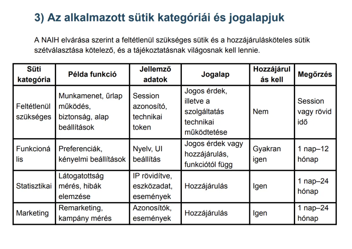3) Az alkalmazott sütik kategóriái és jogalapjuk