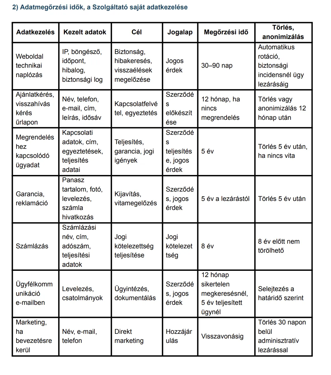 2) Adatmegőrzési idők, a Szolgáltató saját adatkezelése